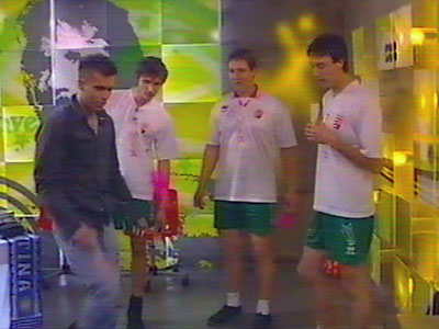 fiúk bemutatták a lábtoll-labdázás trükkjeit. A korábban focista mûsorvezetõ is beszállt a játékba.