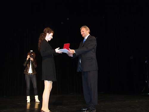 Szabó Nóra veszi át a díjat Hiller István minisztertõl