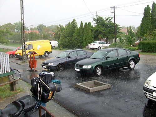Újszászra. Ömlött az esõ, kopogott a jég a tornacsarnok tetején és ablakain.
