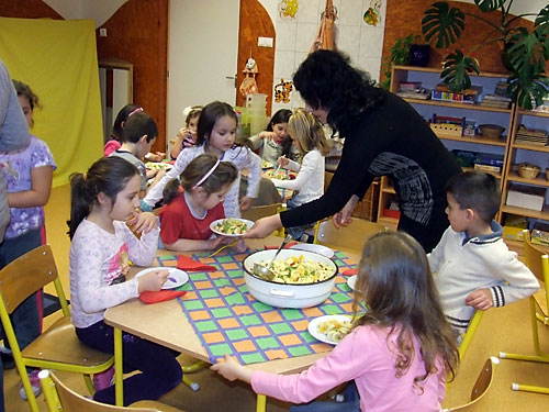 fõzõnapra, amelynek keretében a gyermekek a szüleikkel gyümölcssalátát