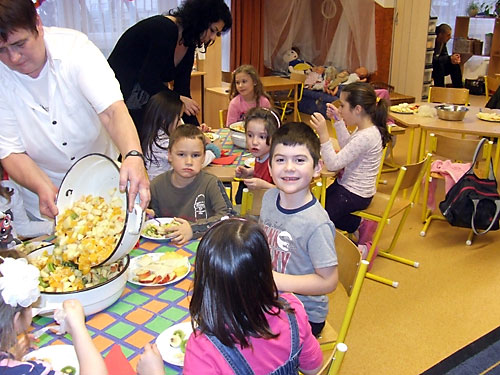 terített asztaloknál közösen fogyasztották el a vitamindús gyümölcssalátát és a