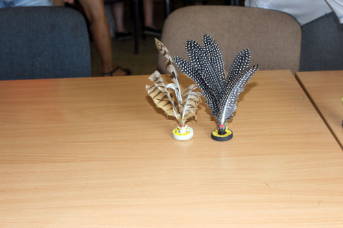 és érdekes alkotás született. A legszebb labda gyöngytyúk tollból készült. A
