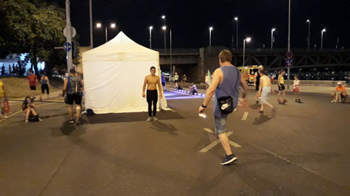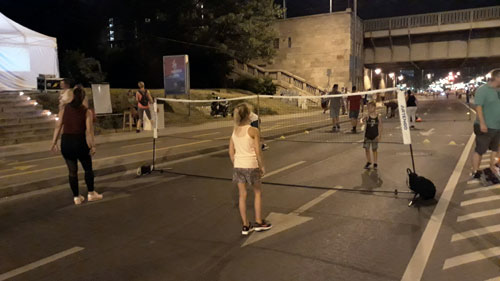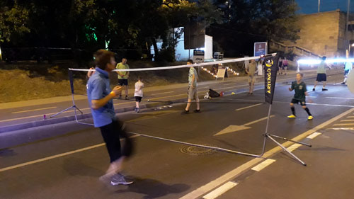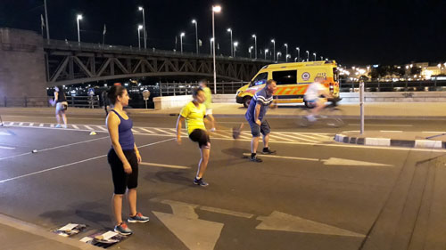 A lábtoll-labda pályák a Petõfi-híd lábánál kivilágított hálókkal,