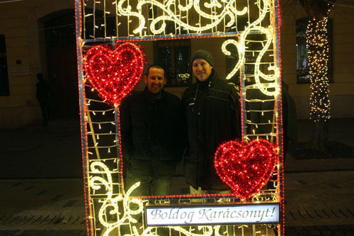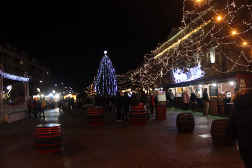 néhányan Szolnok karácsonyi fényekkel díszített fõterén forralt borozással