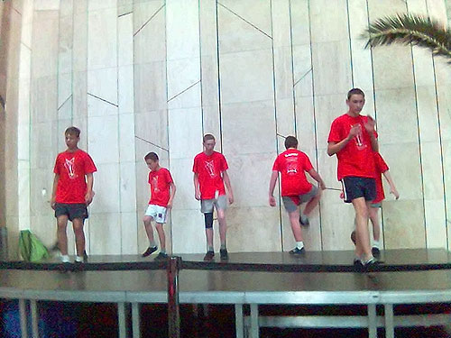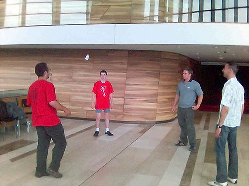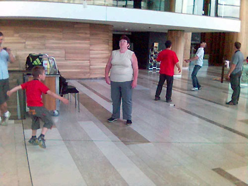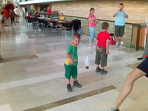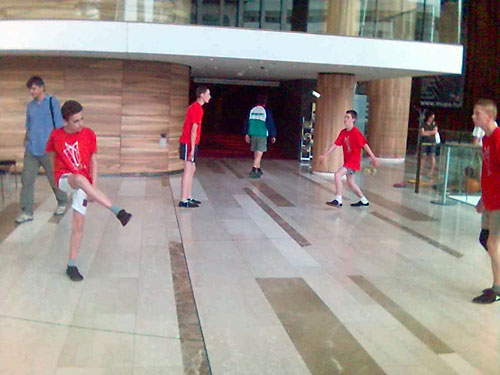 Lábtoll-labdázás a Mûvészetek Palotája folyosóján