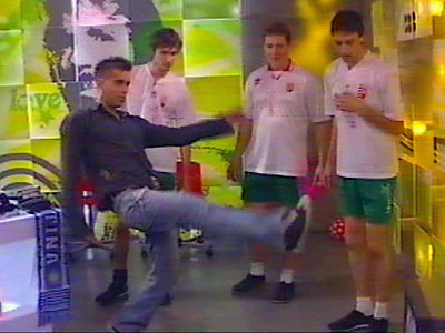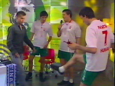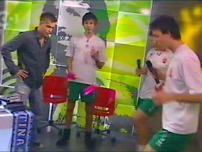 fiúk bemutatták a lábtoll-labdázás trükkjeit. A korábban focista mûsorvezetõ is beszállt a játékba.