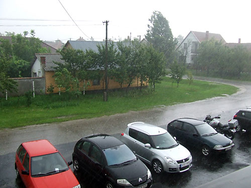 Újszászra. Ömlött az esõ, kopogott a jég a tornacsarnok tetején és ablakain.