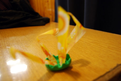 egy négy lyukkal ellátott zöld mûanyag darabot és két papírcsíkot talált,