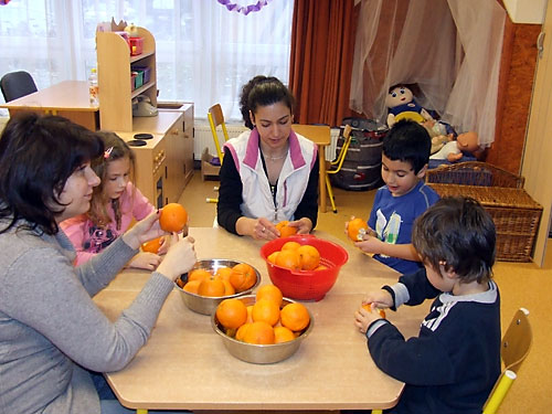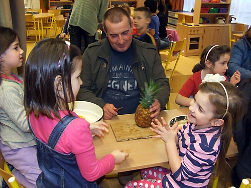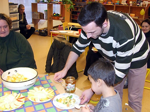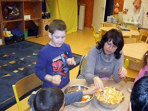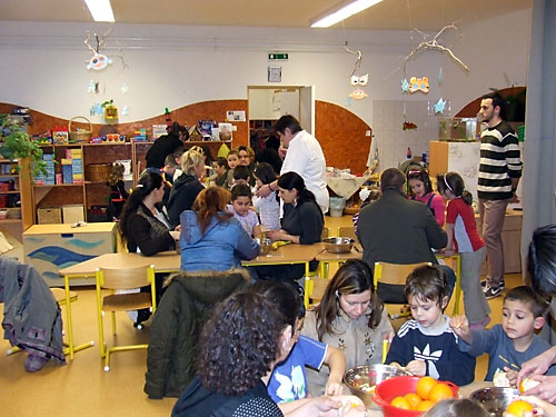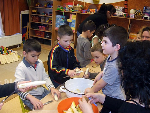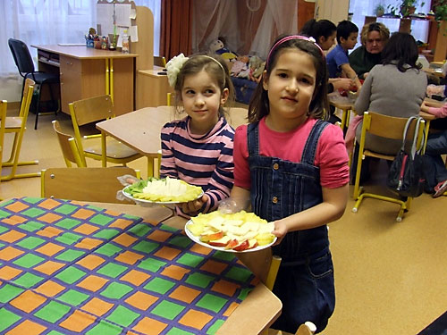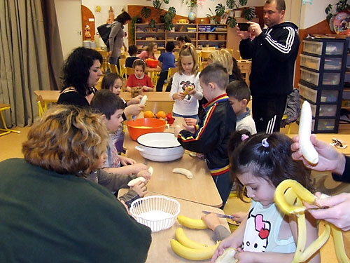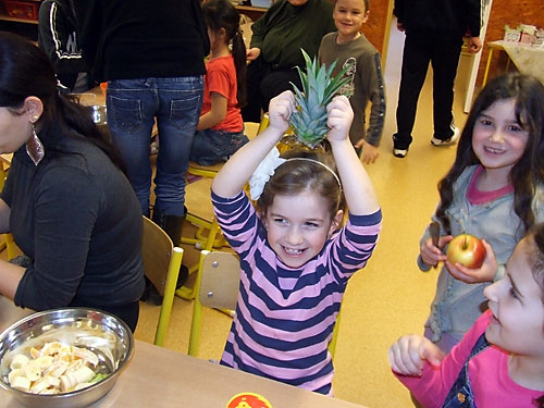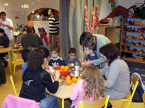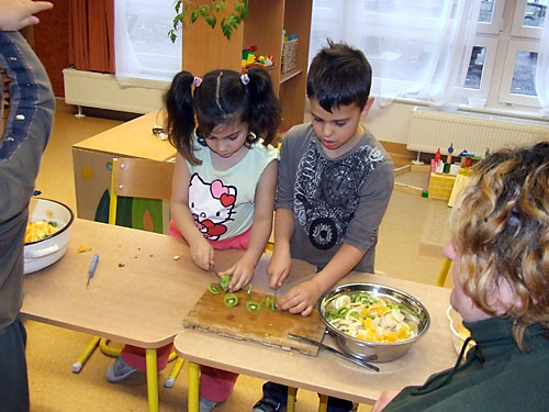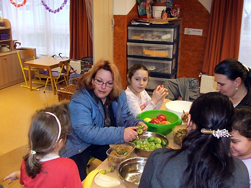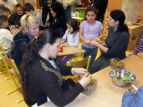 fõzõnapra, amelynek keretében a gyermekek a szüleikkel gyümölcssalátát