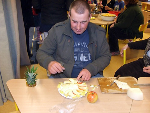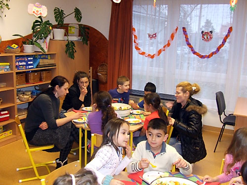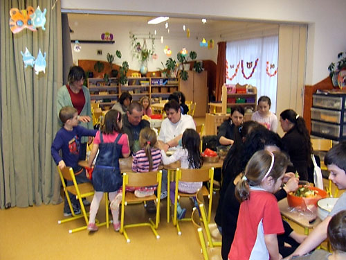 terített asztaloknál közösen fogyasztották el a vitamindús gyümölcssalátát és a