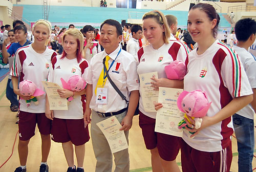 Henriett, Joó Anett, Makai Gréta és Ézsiás Kitti egy singapuri játékvezetõvel