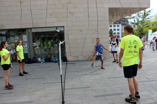 Szeptember 2-án Szolnok Napja alkalmából a szervezõk délután háromtól este nyolcig az Aba-Novák Kulturális Központ elõtti Hild János térbõl Sport teret varázsoltak. Az érdeklõdõk sok sportág – aerobik, asztalitenisz, amerikai futball, biciklis ügyességi pálya, BMX, csocsó, darts, fittkid, jóga, judó, lábtoll-labda, mediball, mini foci, sakk, streetball, szablyavívás, tánc, thai boksz, trambulin, ugrókötél, wing tsun kung-fu, zumba – bemutatóit tekinthették meg, és a sportágak többségét ki is próbálhatták. A lábtoll-labdázást Fehér János vezetésével az Újszászi VVSE játékosai – Bábosik Ádám, Farkas Lilla, Galambos László, Kenyeres Krisztián, Kovács Evelin, Sebõk Roland – mutatták be. A szeles, esõre álló idõ miatt a hálót elõször a Kulturális Központban állították fel, majd a szél mérséklõdése után kiköltöztek a Sport térre, ahol szinte minden korcsoport kipróbálta a lábtoll-labdázást. A legfiatalabb próbálkozó kettõ, a legidõsebb hetvenegy éves volt. Népszerû volt a családi játék is. A jó kedvû játékot hat óra után az esõ szakította félbe.