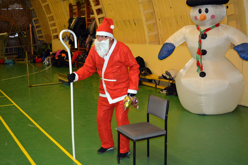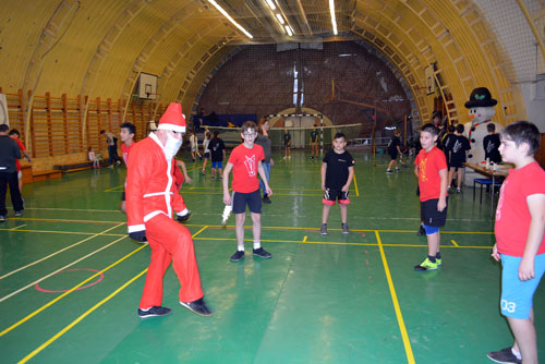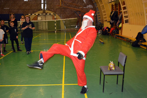 Mikulás, aki szaloncukrot osztott a résztvevõknek, és egy kicsit lábtoll-labdázott