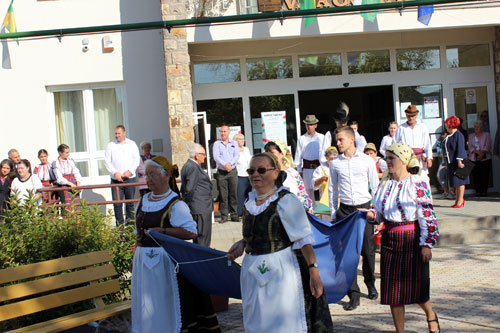 Jászsági és moldvai népviseletben a zászlókísérõk. Mögöttük