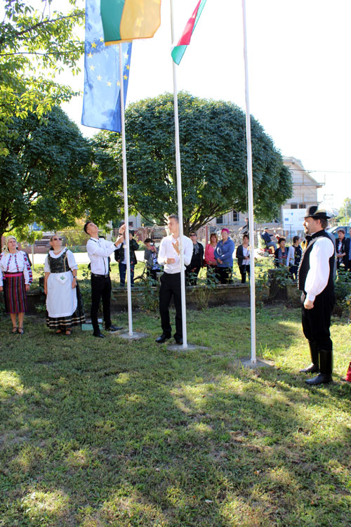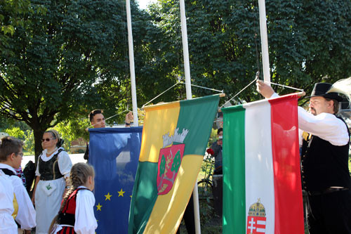 város zászlaját, a nemzeti lobogót és az uniós zászlót Kaló István, a Liliom