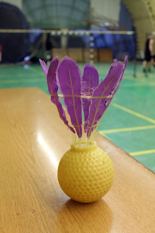 A shuttleball, a tajvani lábtoll-labda 10 centiméter átmérõjû gumilabdába