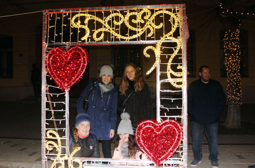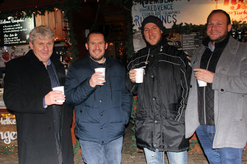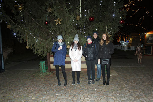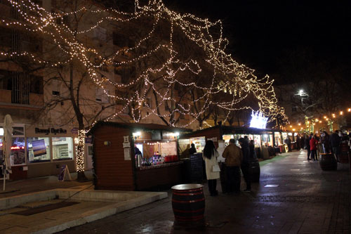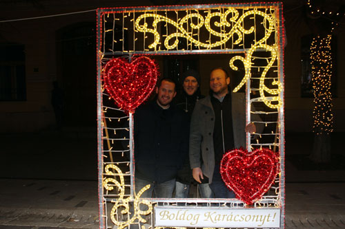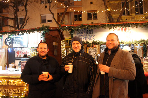 néhányan Szolnok karácsonyi fényekkel díszített fõterén forralt borozással