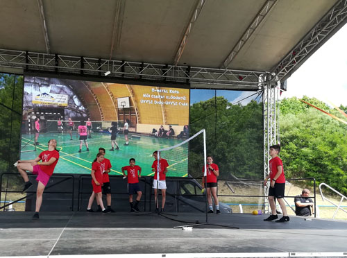 Elõl Fajkó Márk. Hátul a kivetítõn újszászi nõi csapatok