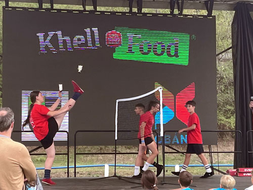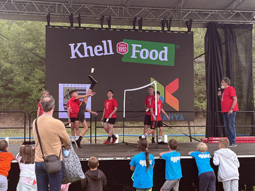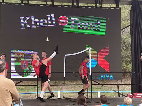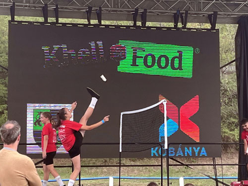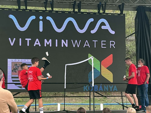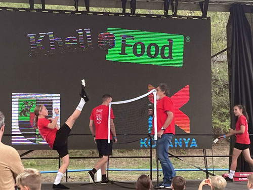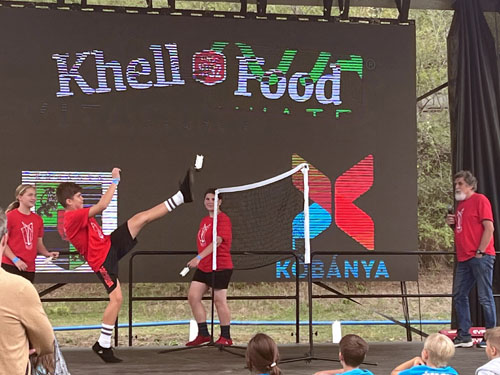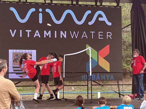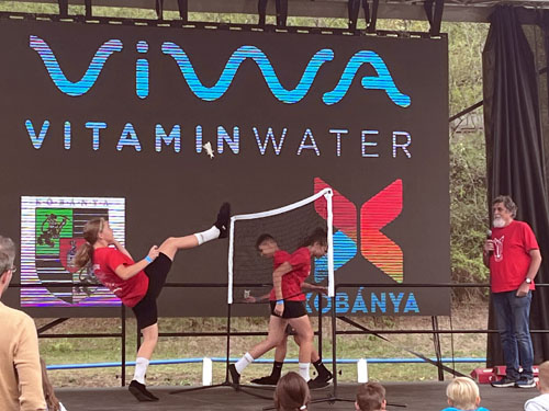 Az Újszászi VVSE lábtoll-labdázói – Bubori Hajnalka, Dániel Petra, Kanalas Renátó, Kovács Boglárka, Oláh Olivér, Zsigmond Tamás – Fehér János konferálásával a nagyszínpadon is megmutatták tudásukat, és nagyon ügyesen rúgták, bûvölték a toll-labdát. Bemutatták a rúgás fajtákat, a különbözõ labdaérintéseket, talpaltak és sáncoltak. Játszottak a színpadon rövid egyéni, páros és csapatmérkõzéseket. Befejezésül zsonglõrködtek. Többeknek jól sikerült a világkör, valamint Kanalas Renátó és Oláh Olivér kétlabdás játéka is.